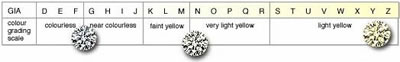 Das Gemological Institute of America (GIA) hat Buchstaben an die Palette der Farb-Typen zugeordnet und beschreibenden Kategorien wie in der folgenden Tabelle zugewiesen. D ist die weißeste (Fehlen der Farbe) und wertvollste Sorte, während die Stufen am anderen Ende schmutzig gelb und weniger teuer sind.