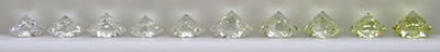 Das Ergebnis der Farbe, den Sie in einem geschliffenen Diamanten sehen hängt größtenteils von seiner Größe, wie er geschliffen wurde und ob oder ob nicht er gefasst ist ab. Je größer der Stein, desto deutlicher wird die Farbe, wie eine zum Beispiel in einer Karaffe Wein sieht man die Farbe deutlicher als in einem Glas.