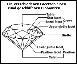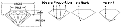 Hinweis: Ein schlecht geschliffener Diamant wirkt nicht richtig in den Augen. Leider sind die meisten Diamanten auf dem Markt schlecht proportioniert . Bei der Suche nach schön geschnittenen Diamanten, sind die beiden Nummern, der Prozentanteil des Tiefschliffes und der Prozentanteil des Flachschliffes wichtig.